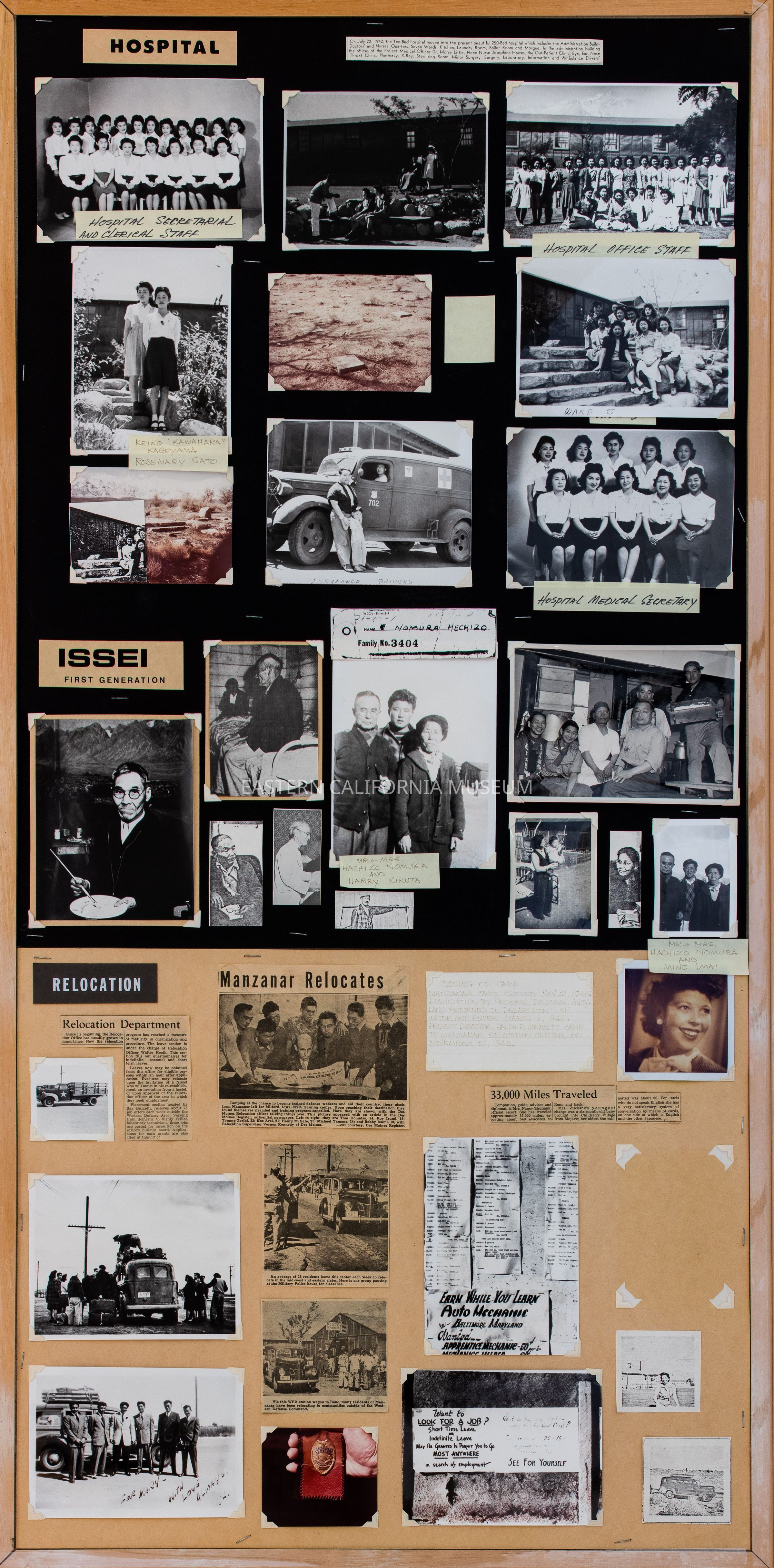 Panel containing photos and information related to the Hospital at Manzanar War Relocation Center, Issei (First Generation), and Relocation.
