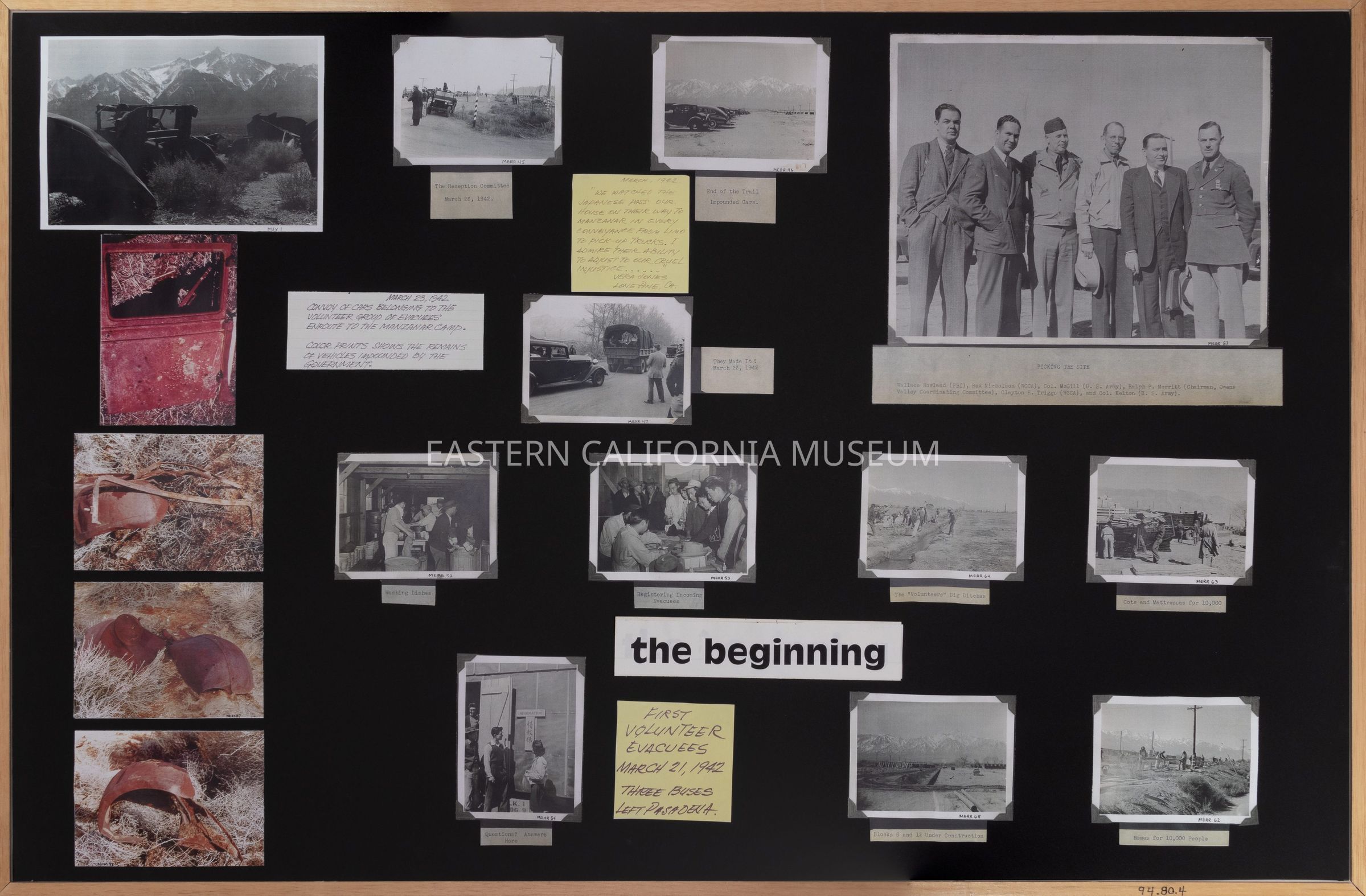 One of two panels about the beginning and end of Manzanar War Relocation Center (see also 1994.80.5). This panel is titled, "The Beginning."