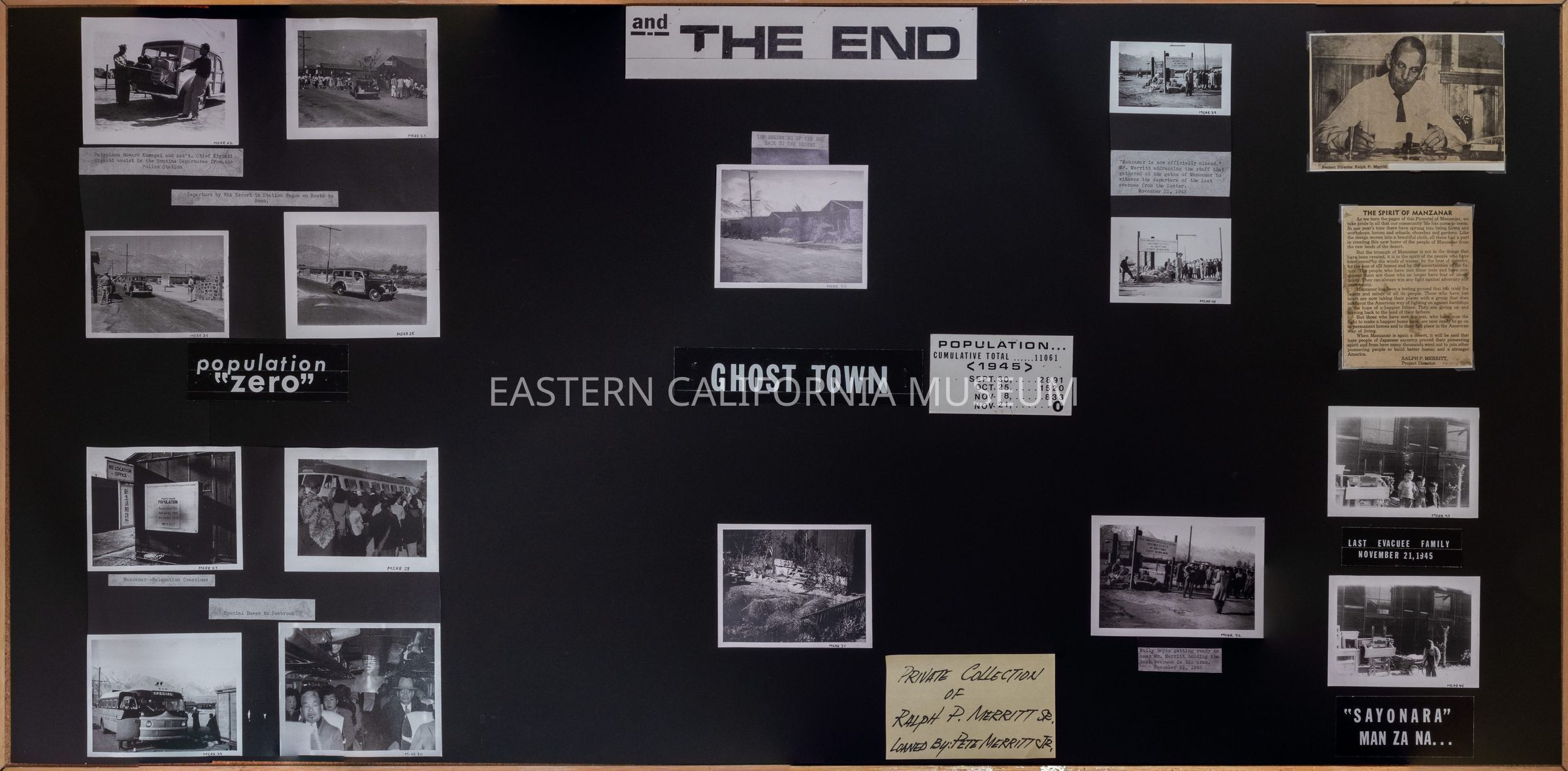 One of two panels about the beginning and end of Manzanar War Relocation Center (see also 94.80.4). This panel is titled, "The End."