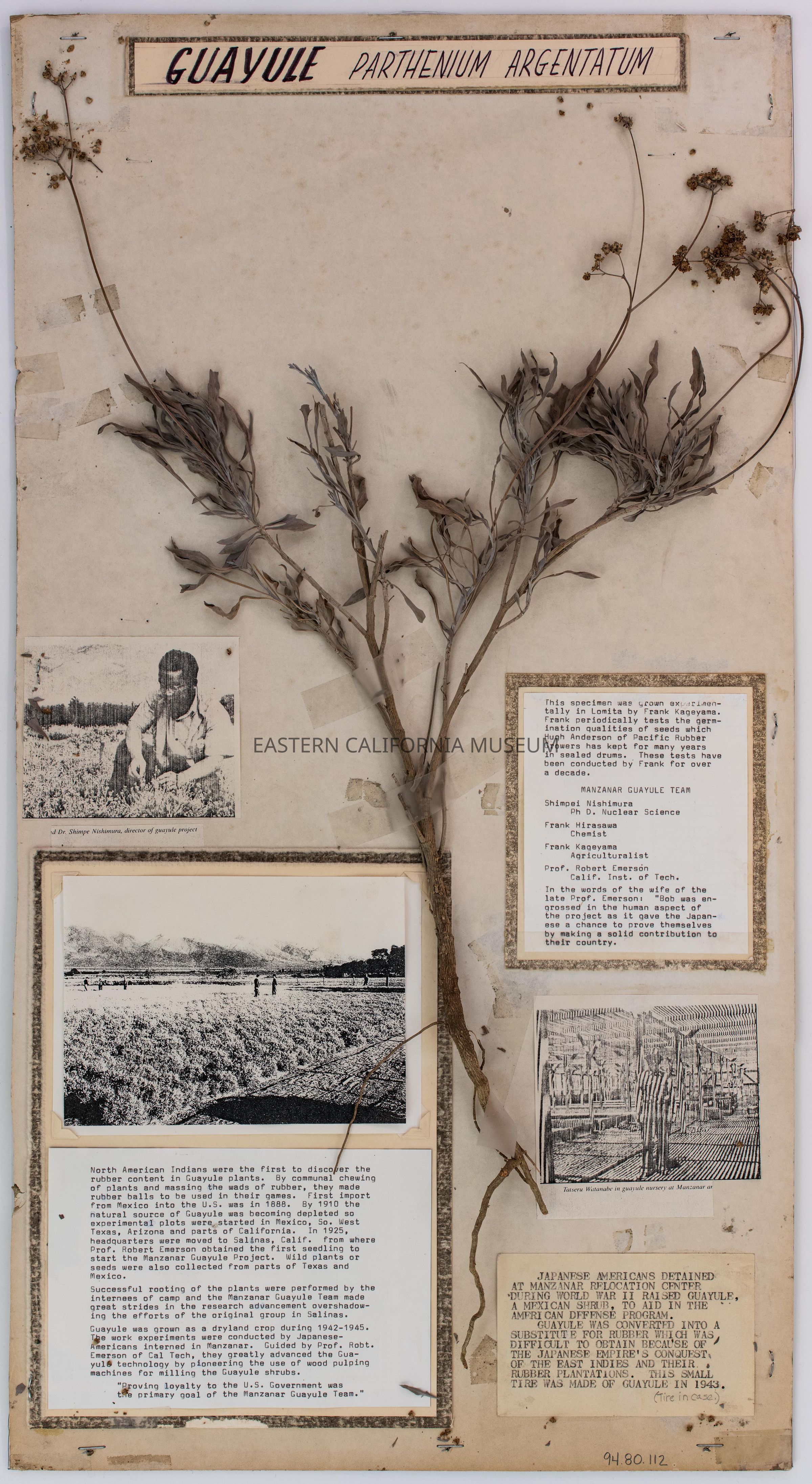 It contains a description of the Guayule Project at Manzanar and sample of the plant, as well as three photocopied photos. One of the photos is of Dr. Shimpe Nishimura and another is of Tatseru Watanabe.
