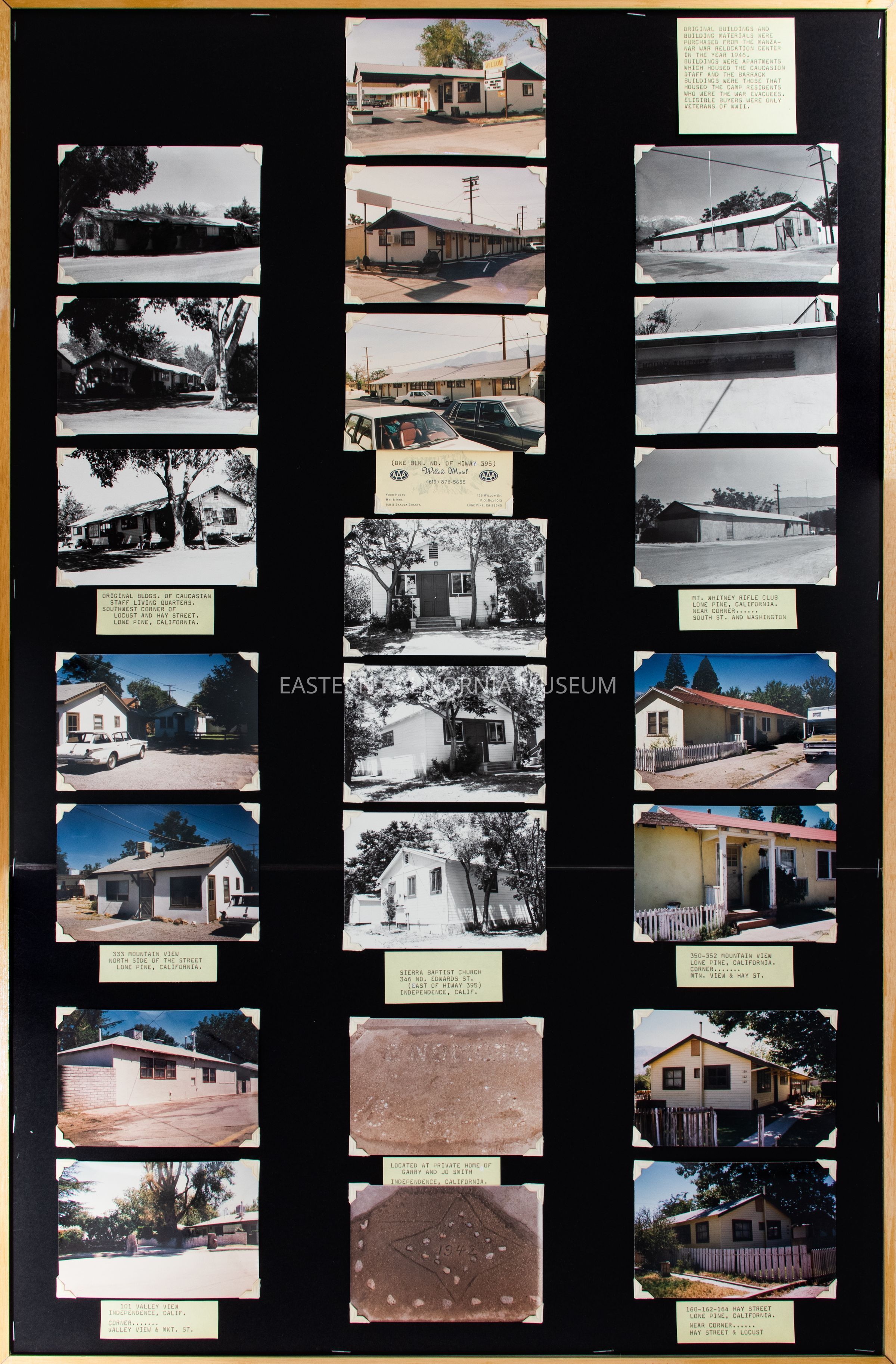 Panel showing buildings constructed from materials purchased from Manzanar War Relocation Center when it was auctioned off and demolished in 1946.