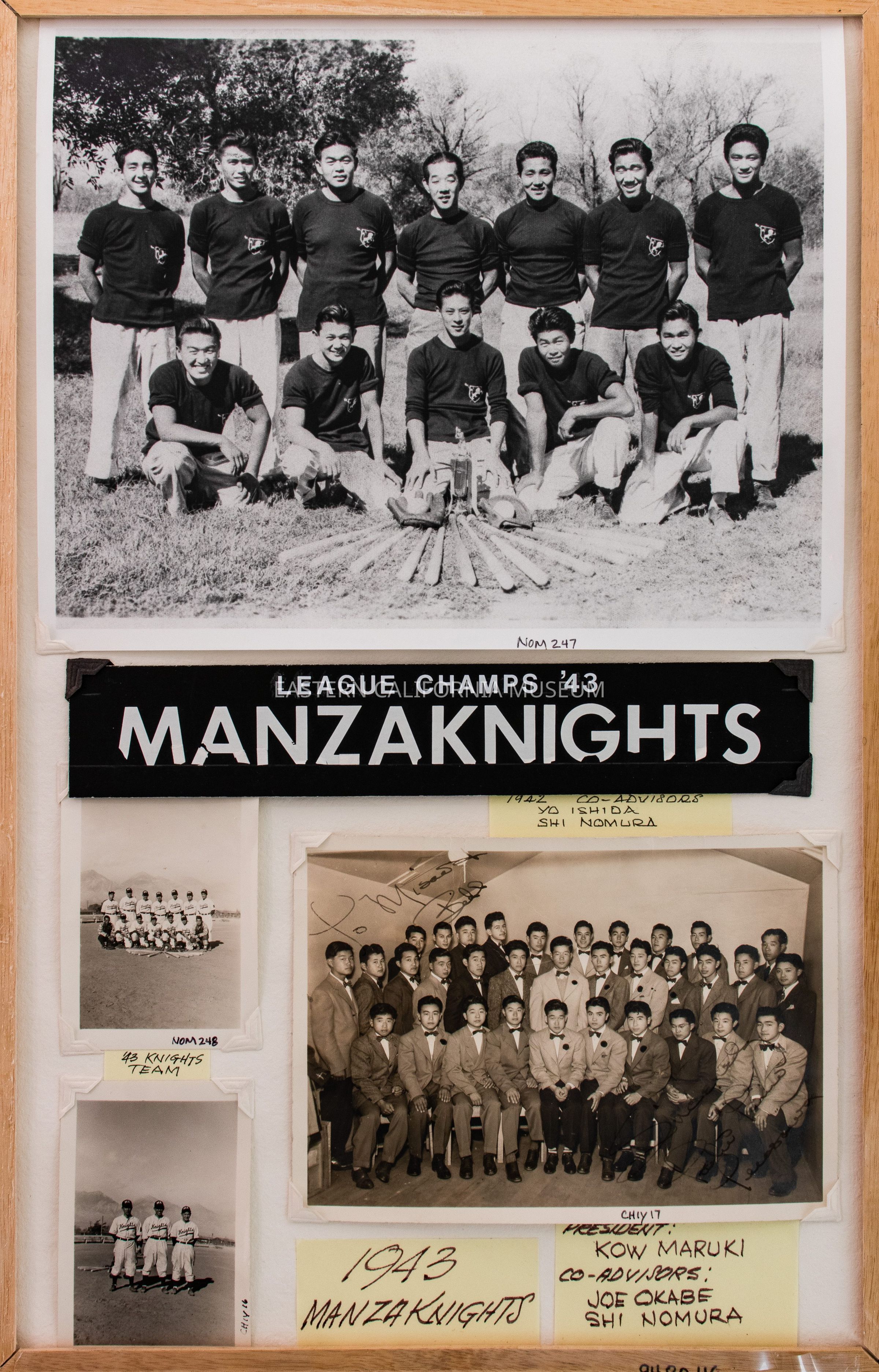 Panel related to the 1943 League Champs, the Manzaknights baseball team, at Manzanar War Relocation Center. It is connected to panel 1994.80.117 via hinges.