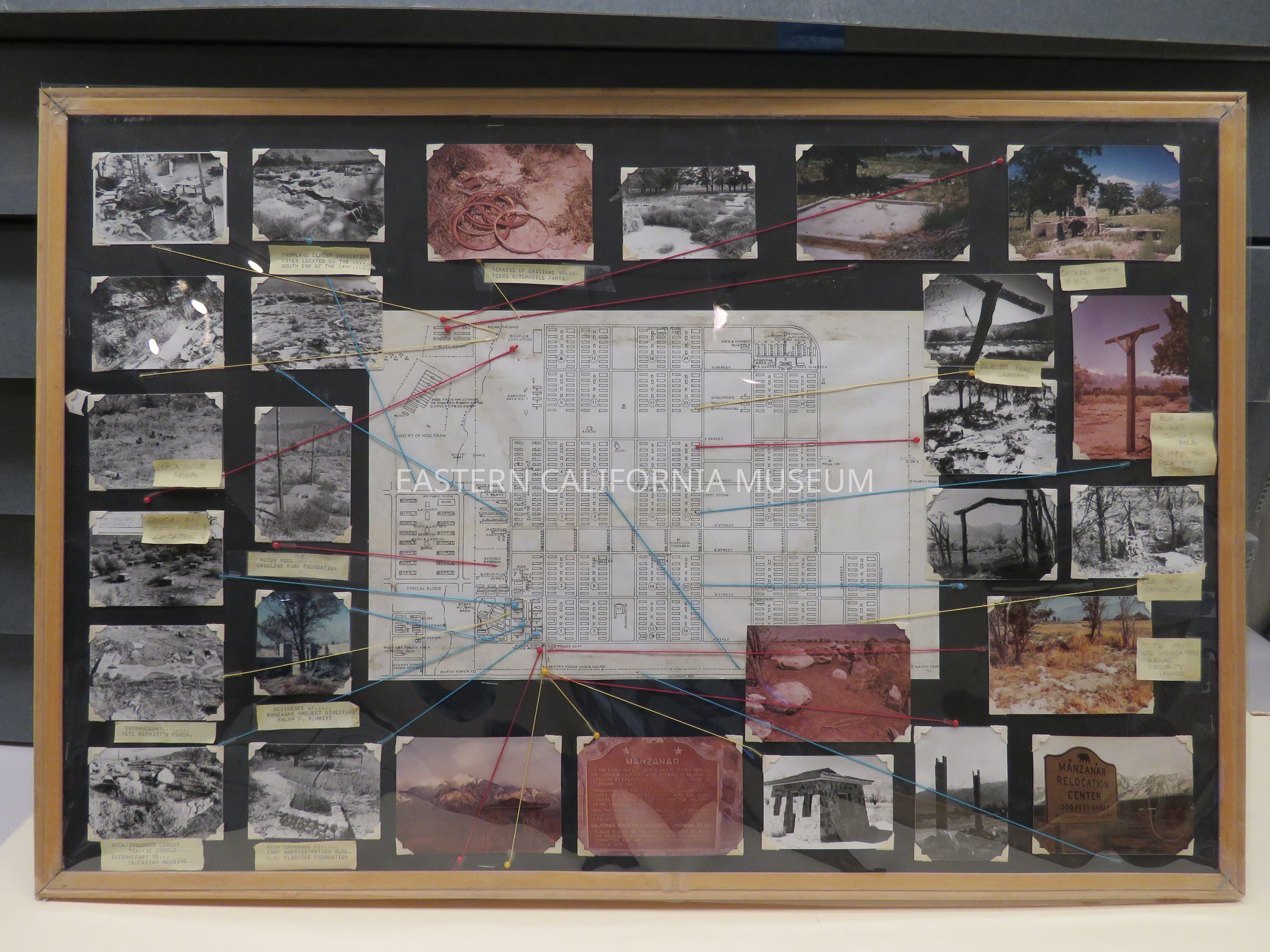 It consists of a map of Manzanar War Relocation Center in the center with 27 photos (color and B&W) connected with their historical location on the map via lengths of colored string and pins. There are fourteen labels identifying the locations in the photos, which include the guayule area, Caucasian mess hall location, entrance way to Pete Merritt's house, entrance way to Caucasian housing, south end of camp, motor pool and gasoline pump foundation, residence of Manzanar Project Director Ralph P. Merritt, main entrance to U.S. flagpole foundation, remains of automobile parts, Block 22 with pond and garden, Chicken BBQ pit, Block 21 and Nomura's pole (pole was stolen in 1985), Block 35 Barrack 8, and Police Department Building 6 foundation (Internal Security Police).Collection