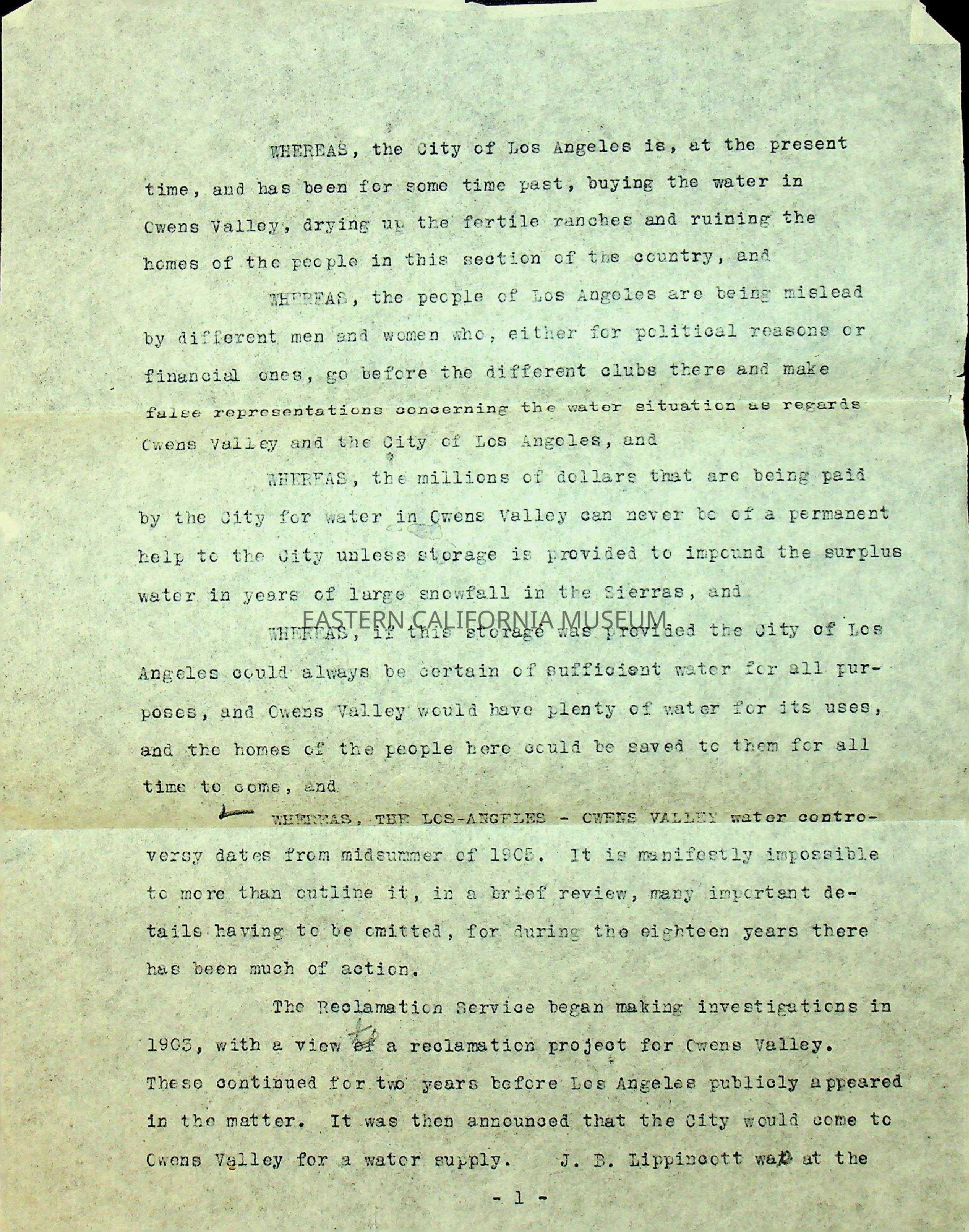 Collection of papers (correspondence, pamphlets, etc.) related to the Los Angeles-Owens Valley Water Controversy. They were included within the scrapbook 1955.696.1.