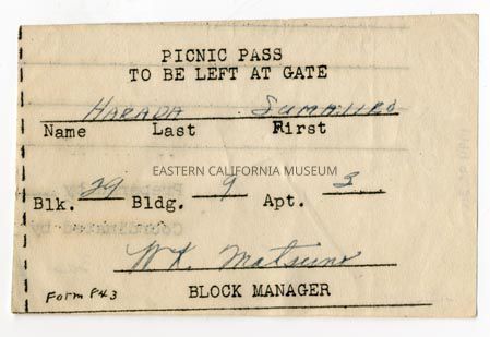 Picnic pass (to be left at gate) for Sumajiro Harada. Address 29-9-3. Signed by a block manager (Matsumo?). Form #843 written in in lower left corner. Pass was printed on recycled paper.Collection