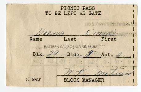 Picnic pass (to be left at gate) for Kimino Harada. Address 29-9-3. Signed by a block manager (Matsumo?). Form #843 written in in lower left corner. Pass was printed on recycled paper.Collection