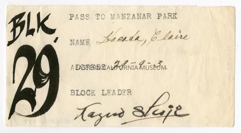 Pass to Manzanar Park for Claire Harada. Address 29-9-3. Block leader's signature (Kageo Shoji?). Calligraphy "Blk. 29" on left side. Paper is tissue thin.Collection