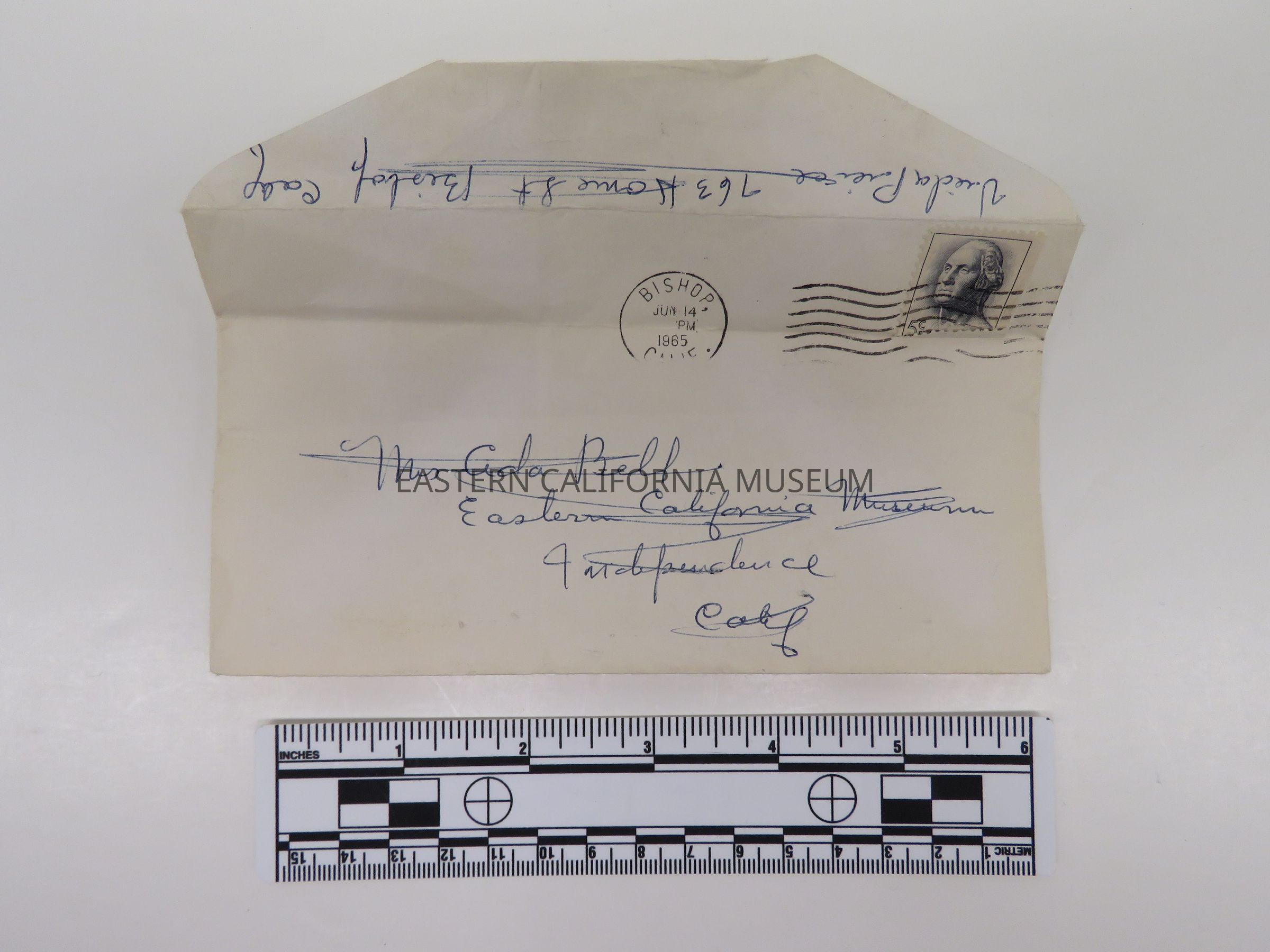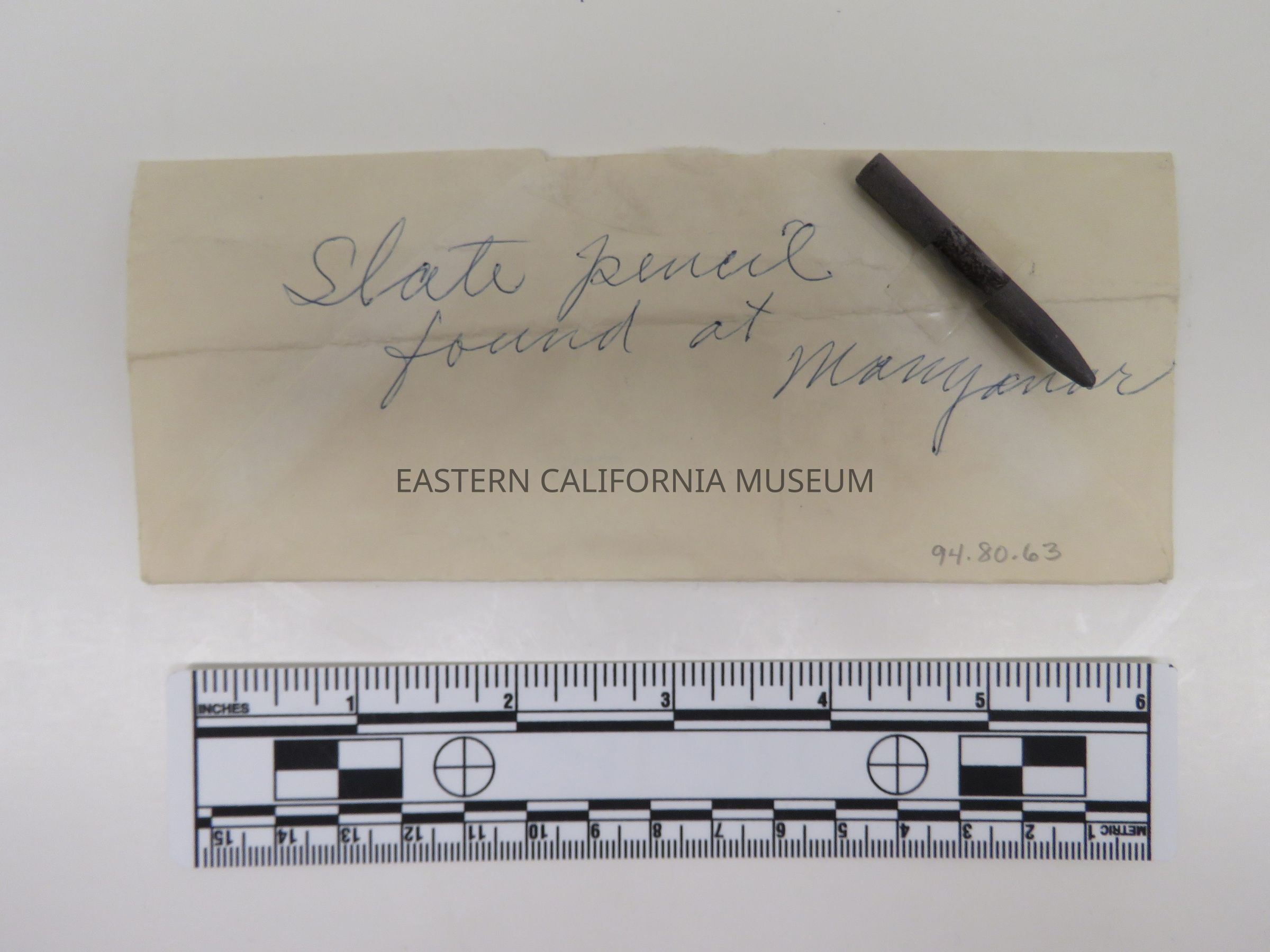 Slate pencil found at Manzanar. It is taped to an envelope that was addressed to the museum in 1965.