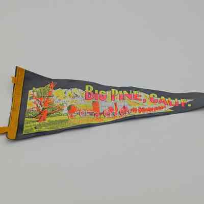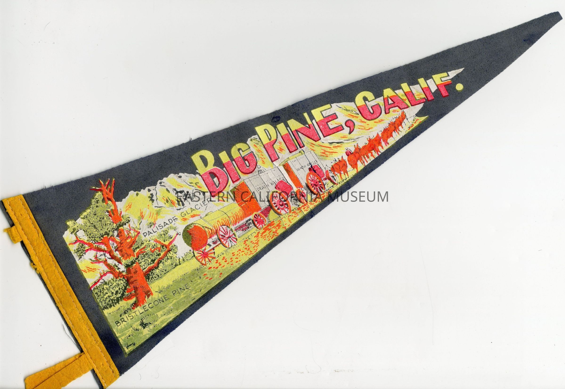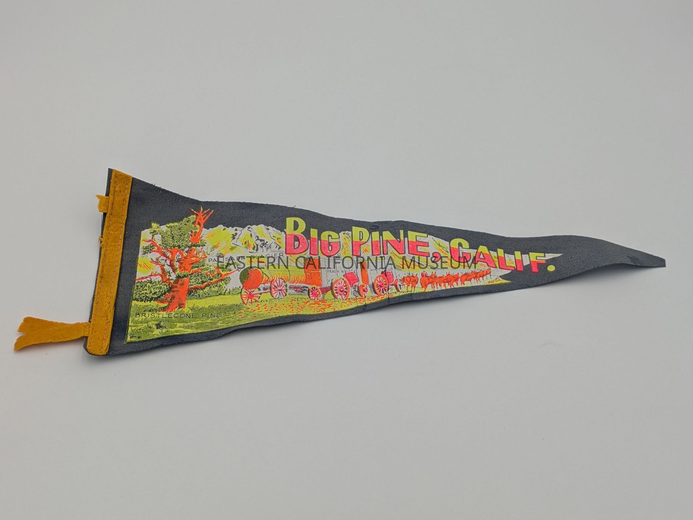 Pennant that says "Big Pine, Calif." in neon pink and yellow on a grey background. Shows the Palisade Glacier, Bristlecone Pine, and a 20 mule team hauling two Death Valley Borax wagons.Provenance