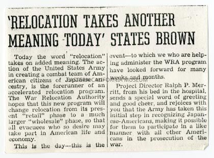 Photocopy of a Manzanar Free Press clipping titled, "'Relocation Takes Another Meaning Today' States Brown."