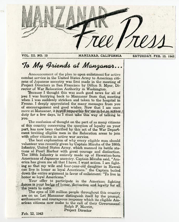 Photocopy of a Manzanar Free Press, Vol. III, No. 13, Feb. 13, 1943 clipping titled, "To My Friends at Manzanar."