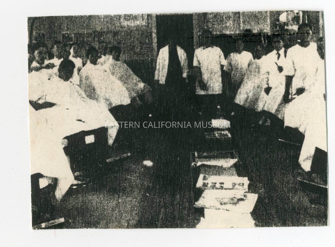 Very poor photocopy of the interior of a barbershop.