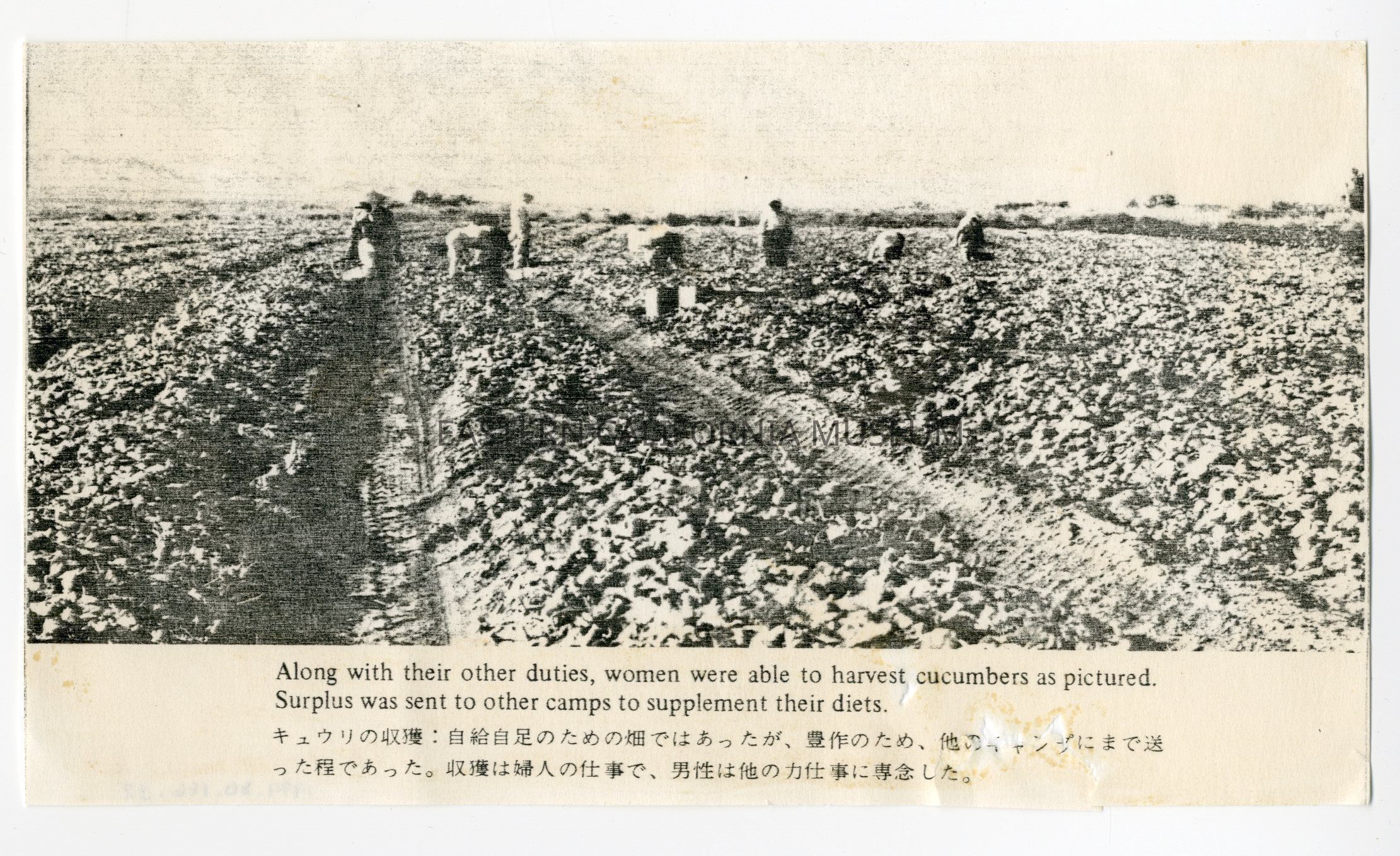 Caption (in both English and Japanese) says: Along with their other duties, women were able to harvest cucumbers at pictured. Surplus was sent to other camps to supplement their diets.