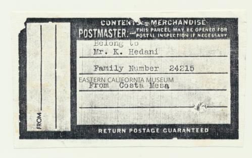 Photocopied mailing label that has "Belong to Mr. K. Hedani / Family Number 24215 / From Costa Mesa" typewritten on it.