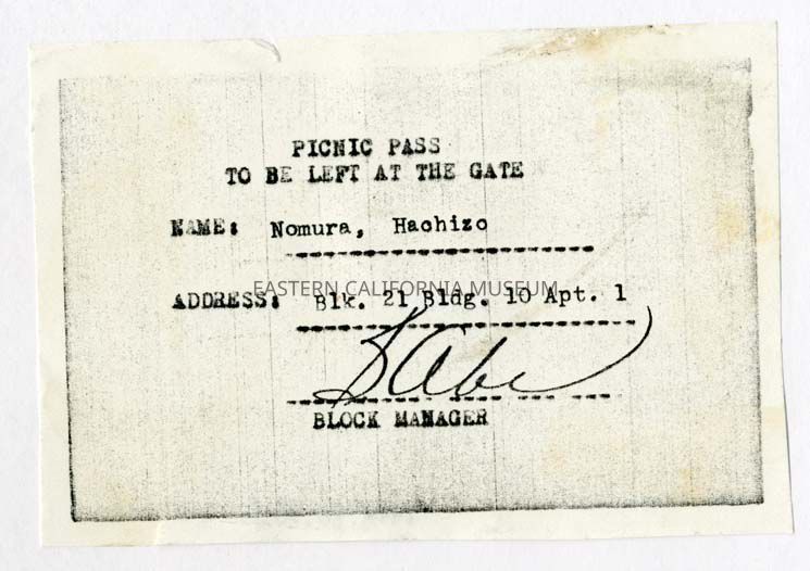 Photocopied picnic pass for Hachizo Nomura (21-10-1) signed by S. Abe, Block Manager.