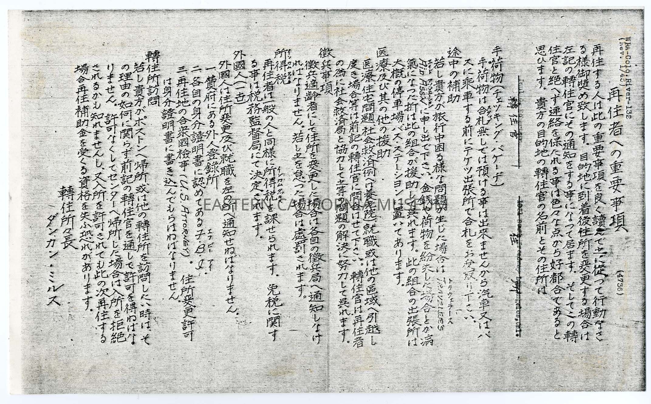 Photocopied document "WRA-Colo. River-132 (Rev. 1/45)" written in Japanese.