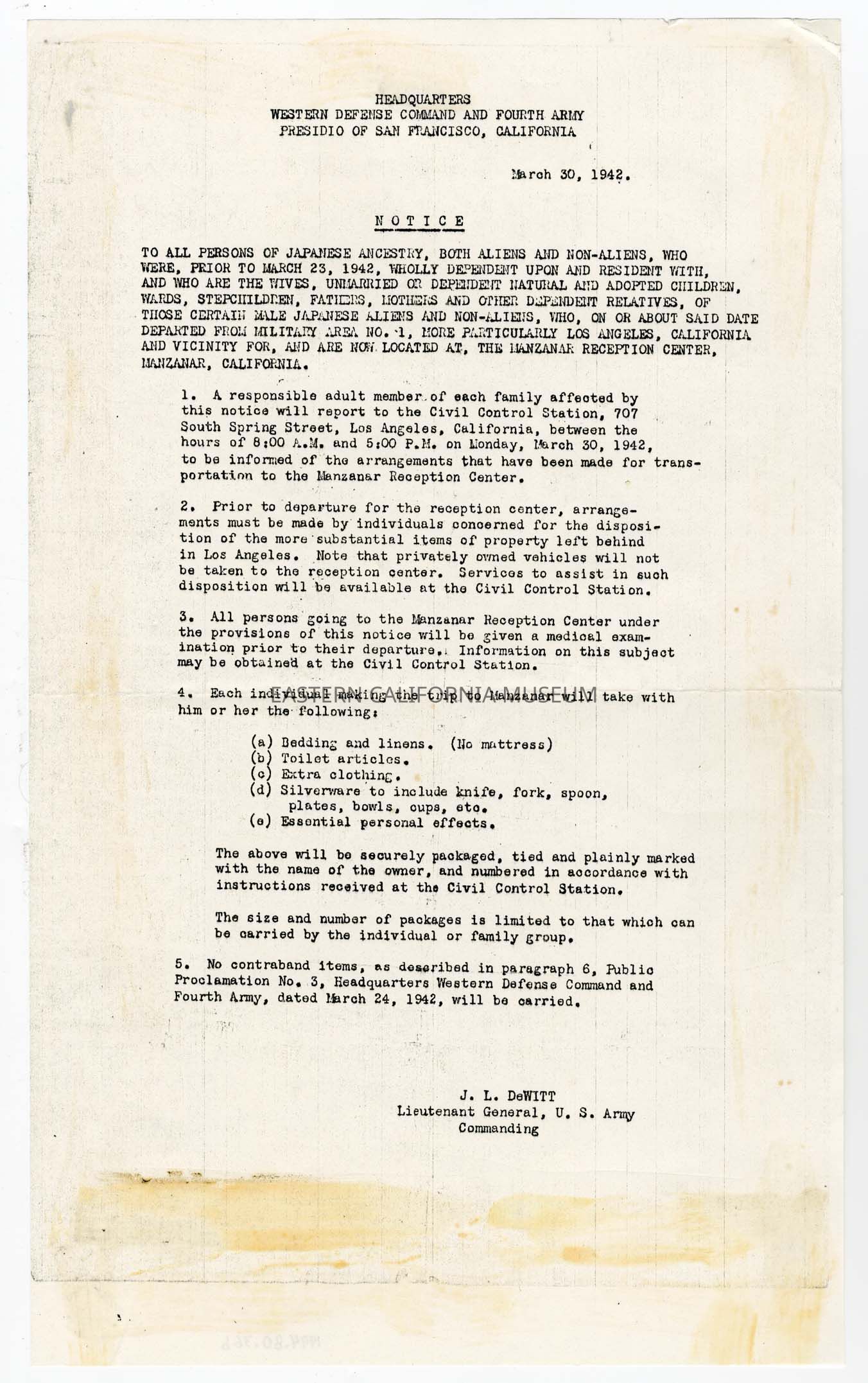 Photocopied copy of the text of Executive Order 9066, dated March 30, 1942 by Lieutenant General of the U.S. Army J. L. DeWitt.