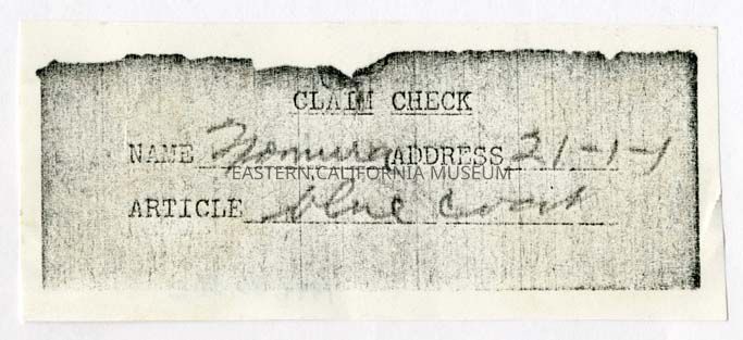 Photocopied claim check for Nomura (21-1-1) for an article described as a blue [illegible].