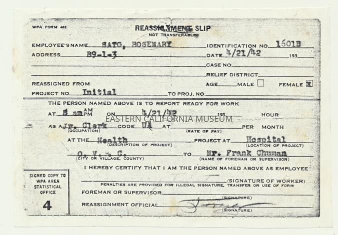 Photocopied reassignment slip "WPA Form 402" for Rosemary Sato, ID #1601-B, address B9-1-3, dated 04/21/1942 to report for work as a junior clerk at the Health Project in O.V.R.C. under the supervision of Frank Chuman.Collection