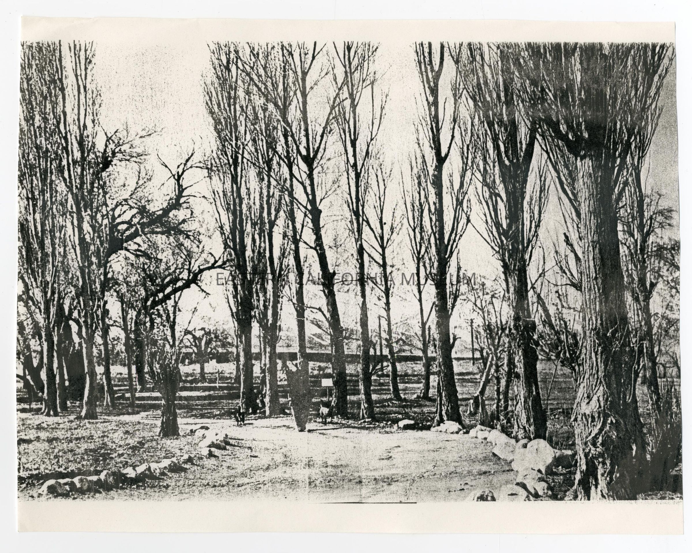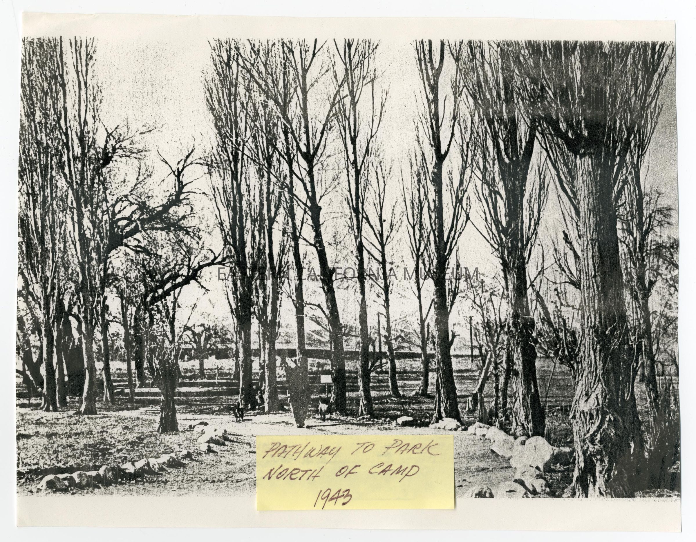 Photocopy of a pathway lined with rocks leading to North Park, on the site of Shepherd Ranch, north of Block 32 in Manzanar. Trees are next to the path.Collection