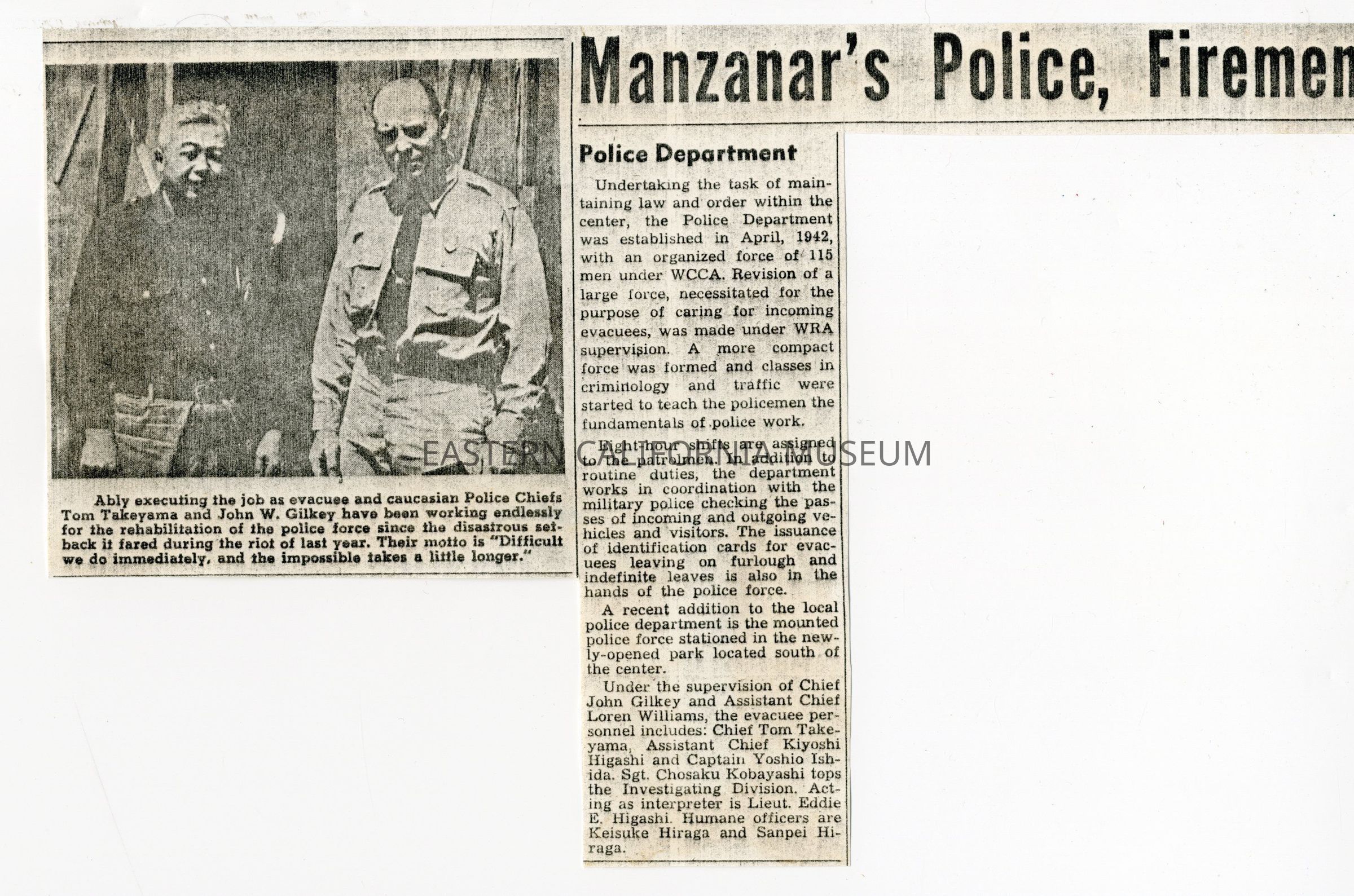 Photocopied newspaper article titled, "Manzanar's Police, Firemen." It contains a photo of two men with the caption, "Ably executing the job as evacuee and caucasian Police Chiefs Tom Takeyama and John W. Gilkey have been working endlessly for the rehabilitation of the police force since the disastrous set-back it fared during the riot of last year. Their motto is 'Difficult we do immediately, and the impossible takes a little longer.'"