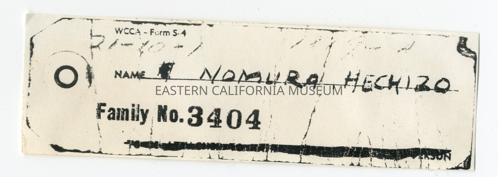 Photocopy of an identification tag for Hachizo Nomura, family no. 3404, address 21-10-1.
