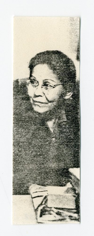 Photocopied photo of a seated woman with items on a table in front of her.