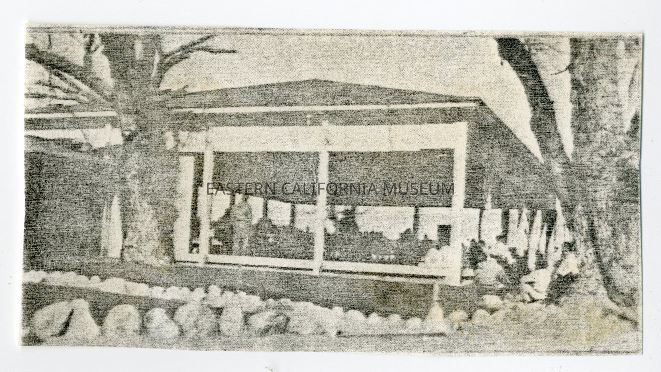 Photocopy of a photo of a building, two large trees, and rock-lined walkways.