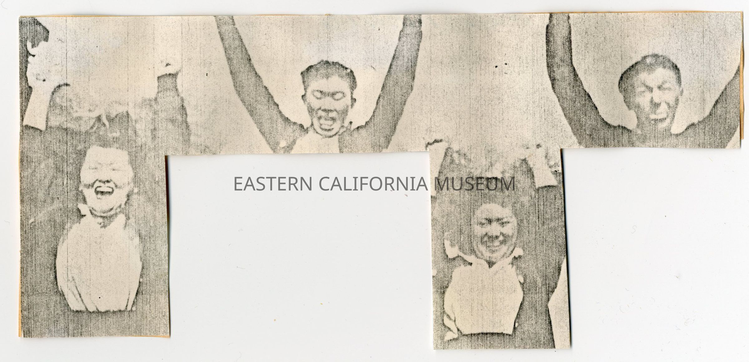 Cut-down photocopied photo of four people jumping, possibly recent graduates?