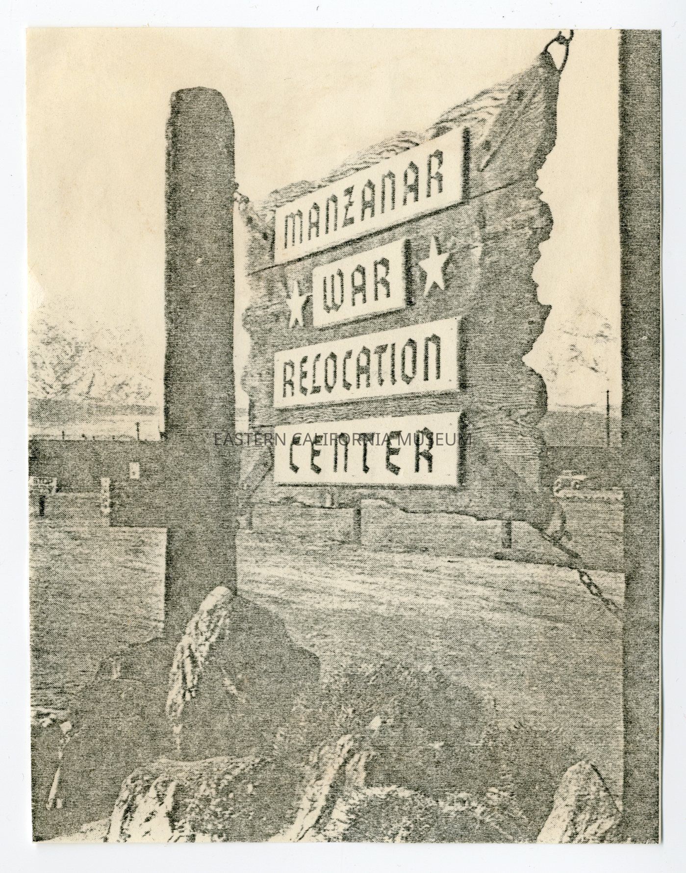Photocopied photo of the sign at the entrance to Manzanar War Relocation Center.