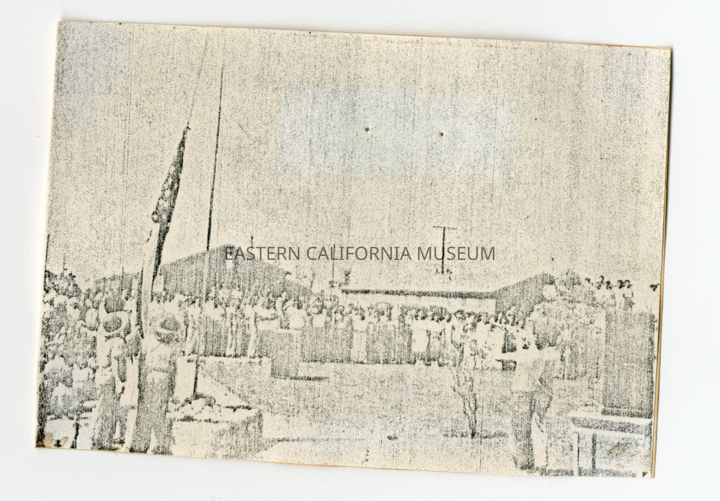 Photocopied photo of a flag being raised or lowered while a crowd stands around the flagpole.