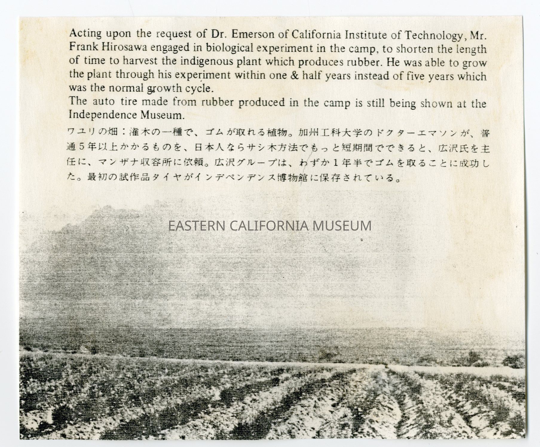 Caption (in both English and Japanese: Acting upon the request of Dr. Emerson of California Institute of Technology, Mr. Frank Hirosawa engaged in biological experiment in the camp, to shorten the length of time to harvest the indigenous plant which produces rubber. He was able to grow the plant through his experiment within one & half years instead of five years which was the normal growth cycle. The auto tire made from rubber produced in the camp is still being shown at the Independence Museum.Collection