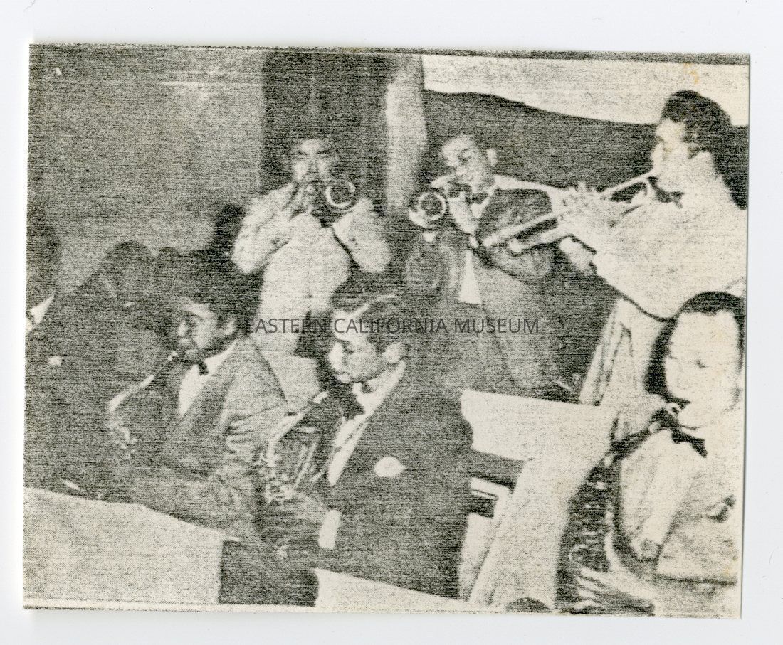 Photocopy of a photo of a band or orchestra playing instruments.