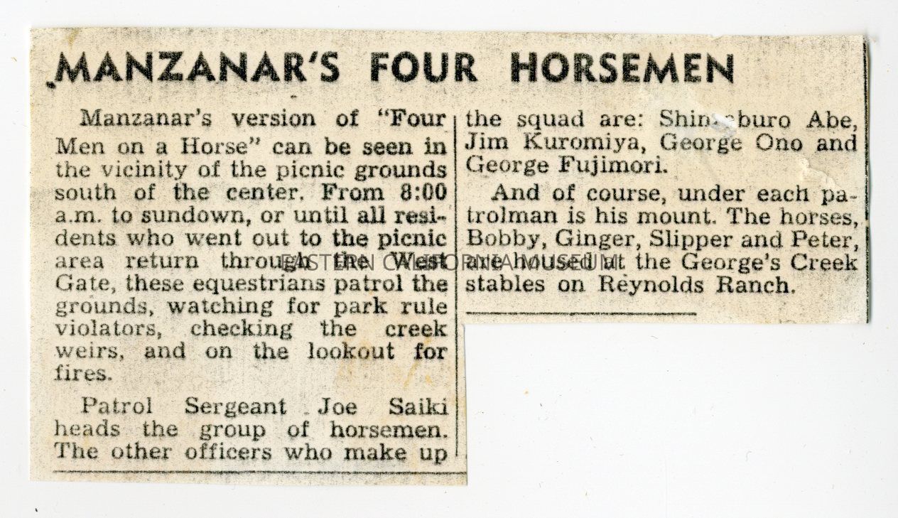 Photocopied newspaper article titled, "Manzanar's Four Horsemen."