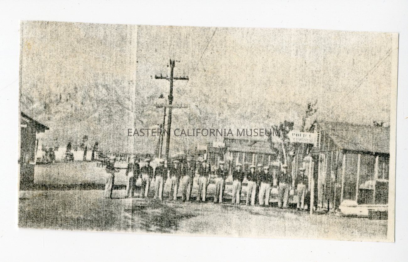 Photocopied photo of a row of men in uniform in front of the Police Department at Manzanar War Relocation Center. There are barracks, power poles, and mountains visible.Collection