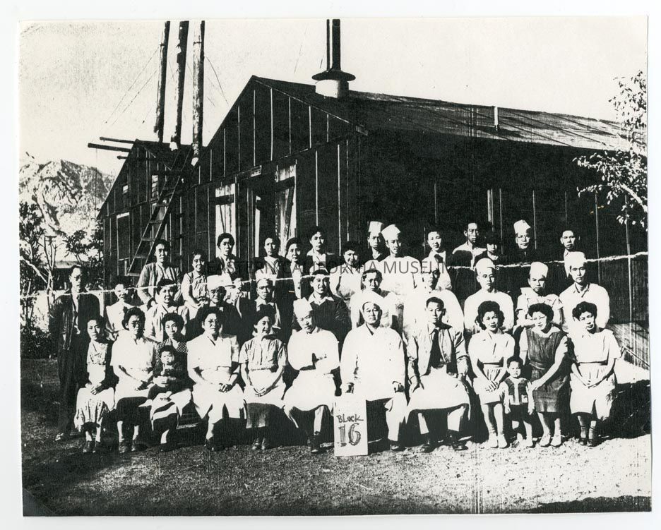 Photocopy of an exterior photograph showing group of 35 people in 3 rows with a sign in the front row that says Block 16. Some of the people are wearing white coat, aprons, and caps that indicate they are part of the kitchen staff.