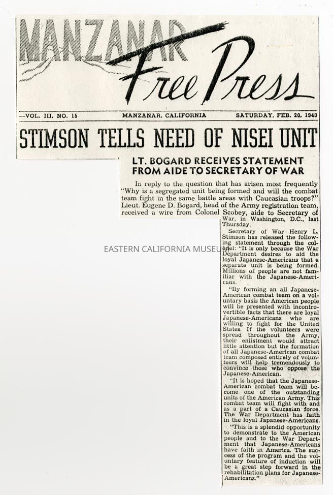 Photocopy of a Manzanar Free Press, Vol. III, No. 15, Feb. 20, 1943 clipping titled, "Stimson Tells Need of Nisei Unit."
