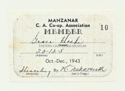 Photocopied Manzanar C. A. Co-op. Association Member card for Grace Hachi (20-12-5), for the period of October-December 1943. The activity was stenciling.Collection
