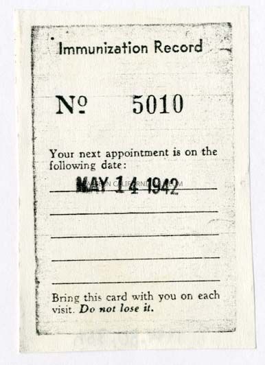 Photocopied immunization record #5010. "You next appointment is on the following date: May 14, 1942."