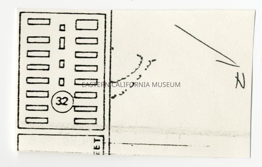 Photocopied section of a map of Manzanar War Relocation Center showing Block 32 and an arrow to the north.