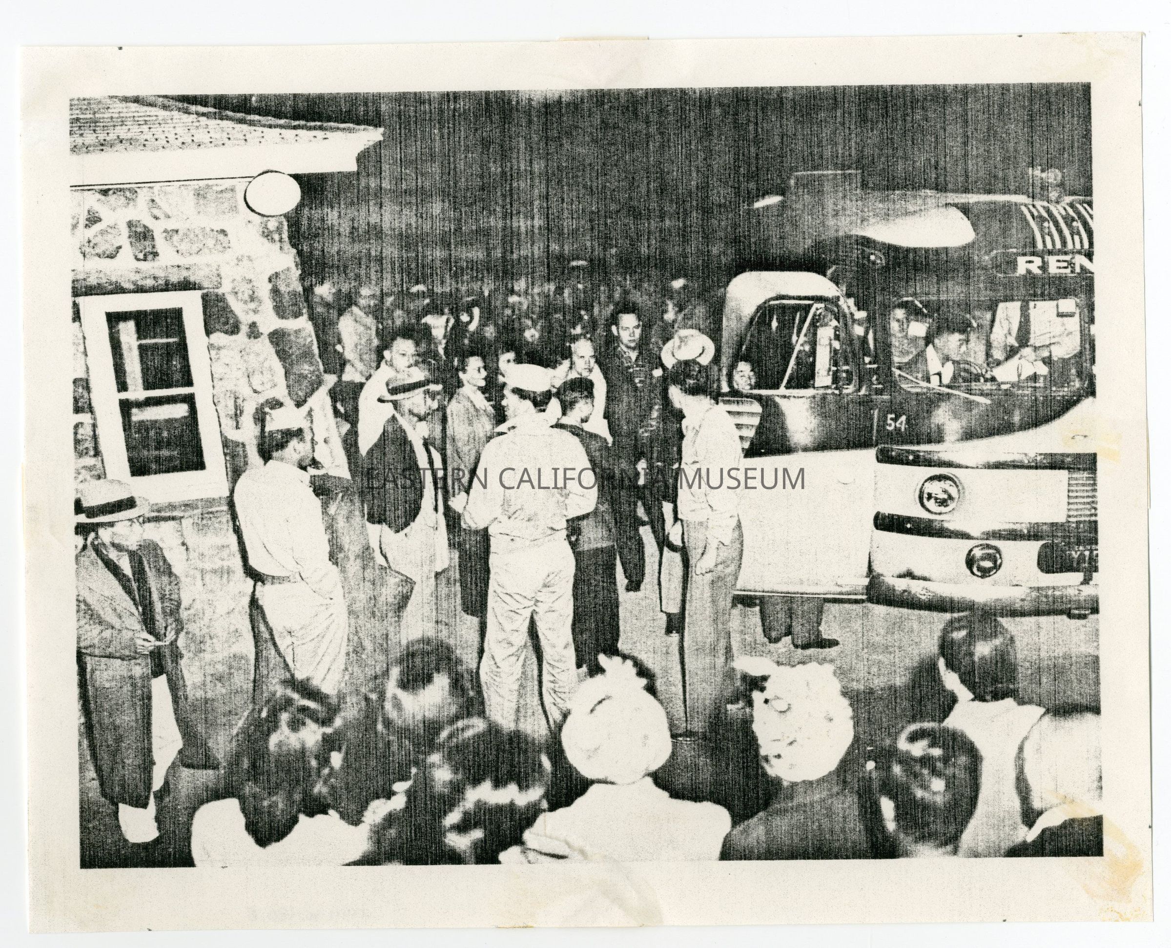 Photocopied photo of a crowd of people and a bus at the entrance to Manzanar War Relocation Center taken by Toyo Miyatake. The sentry post is visible to the left.Collection