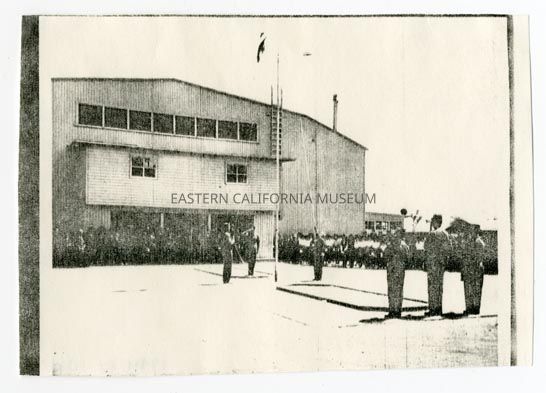 Photocopy of a flag ceremony at Manzanar War Relocation Center with the auditorium in the background. It is likely part of the memorial service for Sgt. Kiyoshi Robert Nakasaki and Pfc. Sadao "Spud" Munemori, who were killed in action in Italy, April 5, 1945.Collection