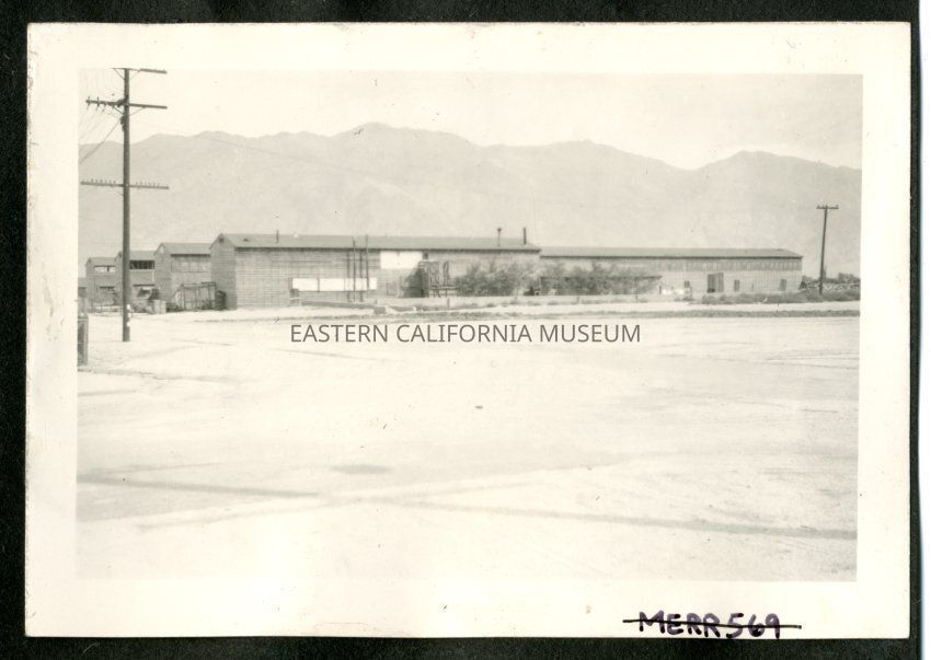 Photograph of the warehouses used to construct camouflage netting at Manzanar War Relocation Center. A large dirt field is prominent in the foreground and four warehouse buildings are visible in front of the Inyo Mountains.Photograph Details
