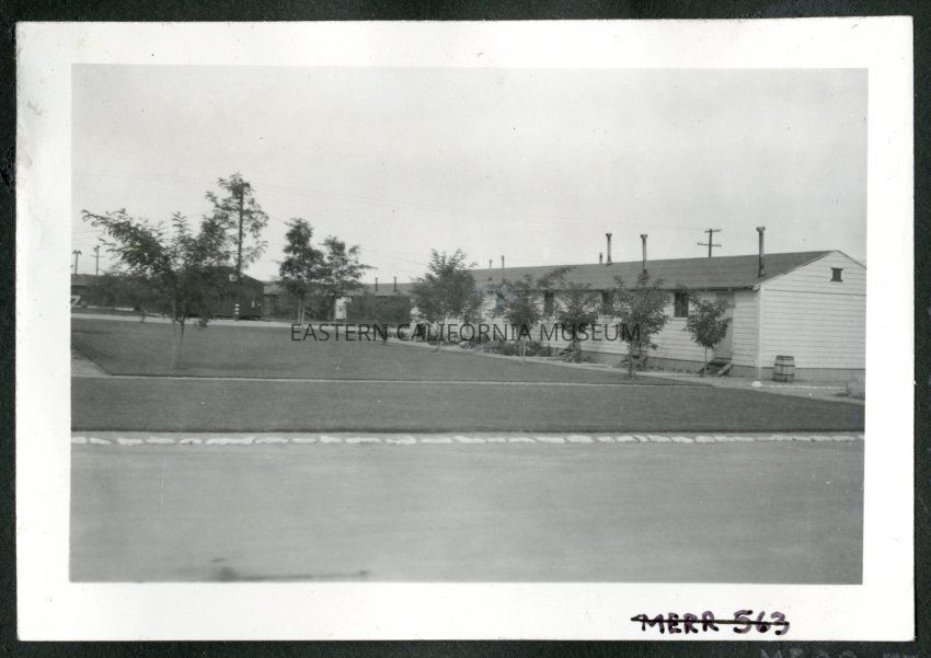 Photograph of staff housing at Manzanar War Relocation Center. The exterior of the building is white panelings, and four small porches and doors are visible. Trees line the edge of the landscaped grass and sidewalks on the side closest to the building. Black tar-paper barracks can be seen in the background.Photograph Details