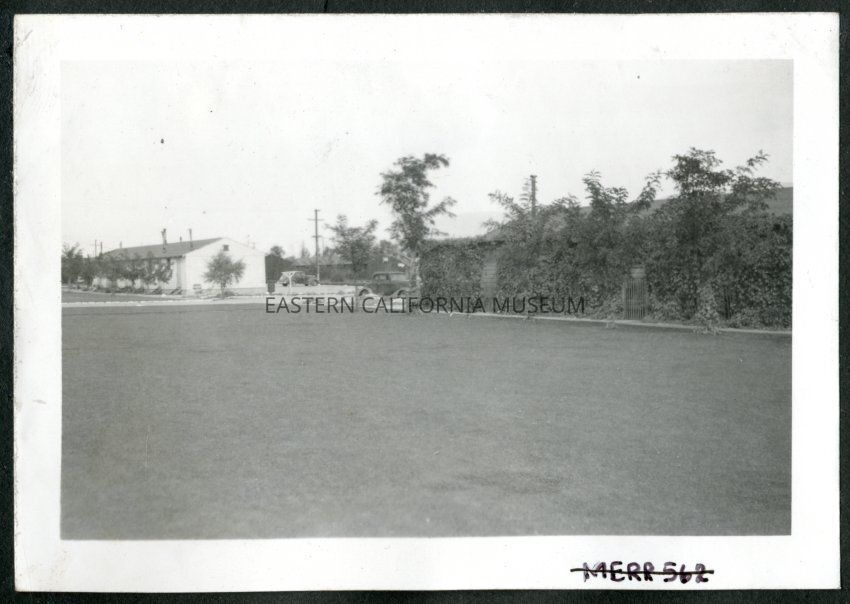 Photograph of staff housing at Manzanar War Relocation Center. A large grass field dominates the foreground with a vegetation covered fence on the right. The white-paneled staff housing building is in the left midground. A car and black tar-papered building can also be seen in the background.Photograph Details