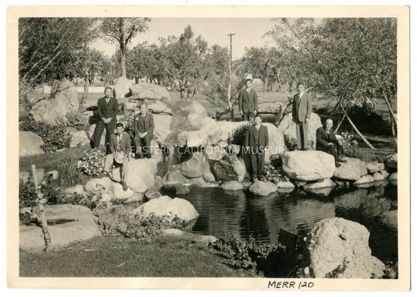 Photograph of seven men arranged around the waterfall feature of the pond at Pleasure/ Merritt Park at Manzanar Incarceration Camp. They are all wearing suits and ties.Photograph Details