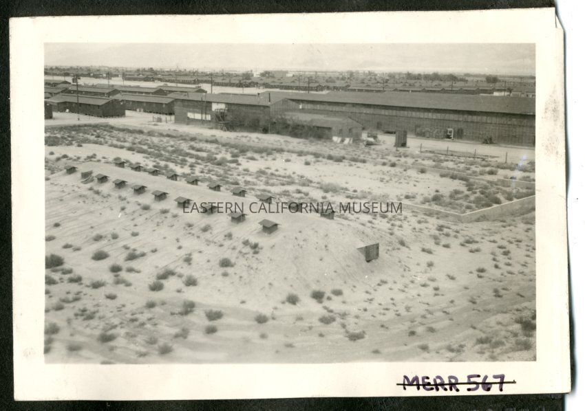 Photograph of the vegetable cellars at Manzanar War Relocation Center. Behind the cellars several warehouse (possibly the camouflage construction buildings) are visible with several blocks of barracks receding into the background.Photograph Details