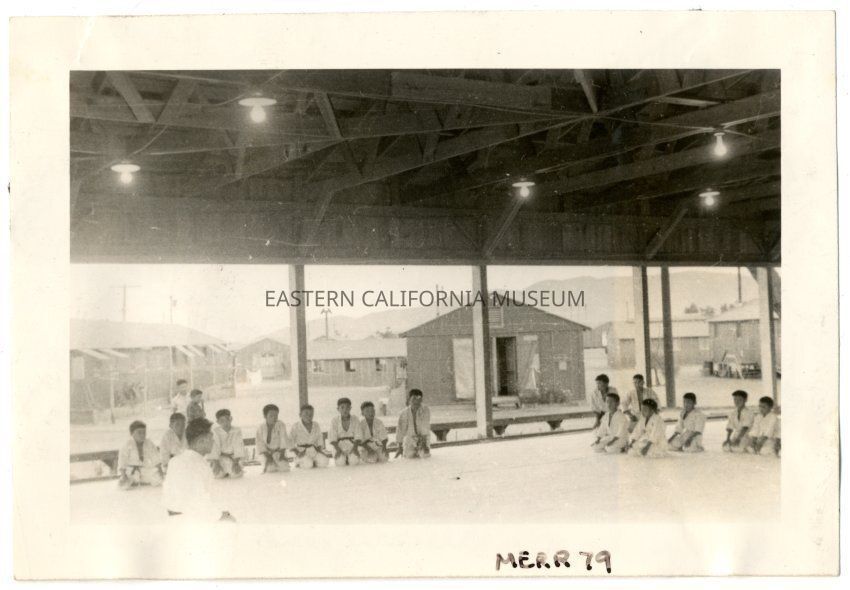 Photograph of young boys kneeling on the dojo mat at the Manzanar Incarceration Camp Judo Dojo. The sensei can be seen kneeling in the lower left corner. Barracks and other buildings can be seen behind the dojo along with the Alabama Hills.Photograph Details