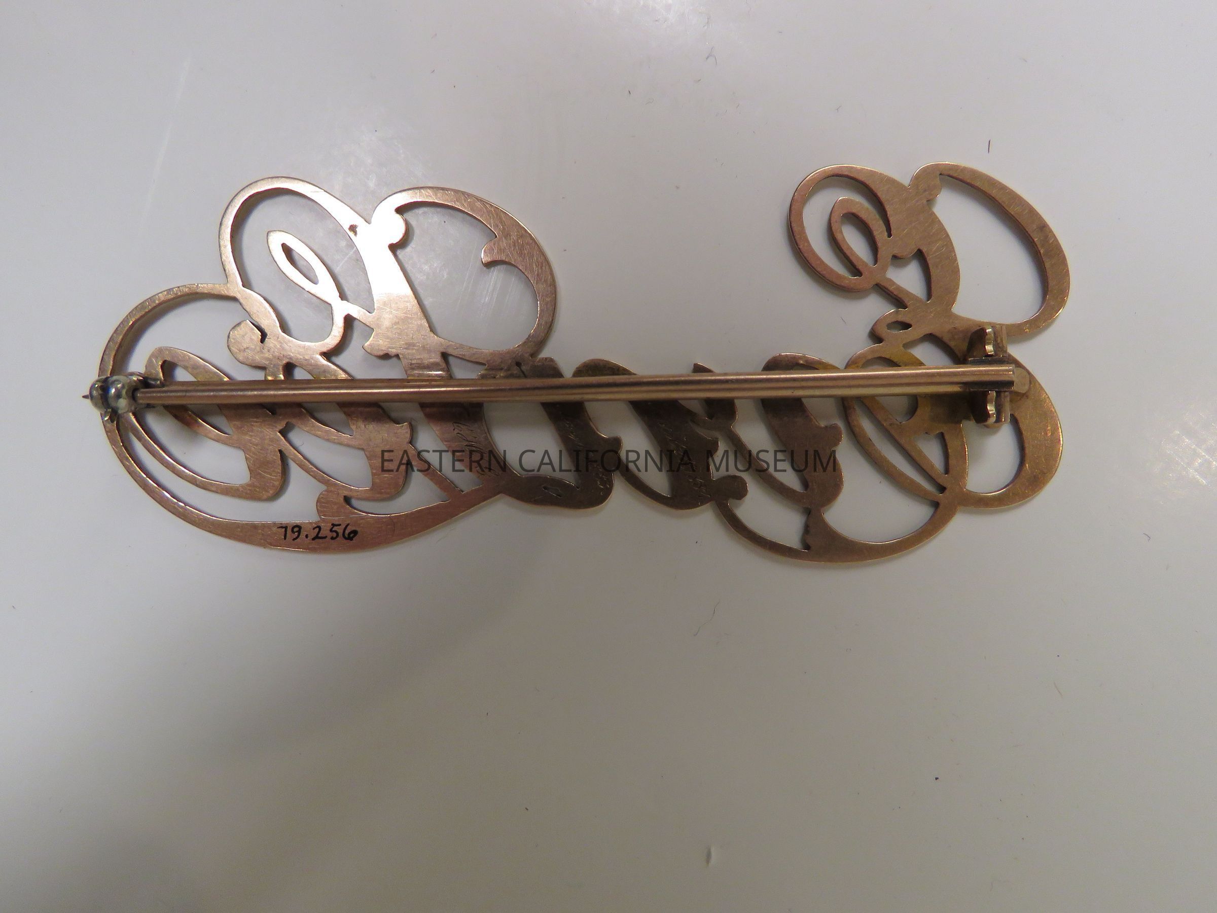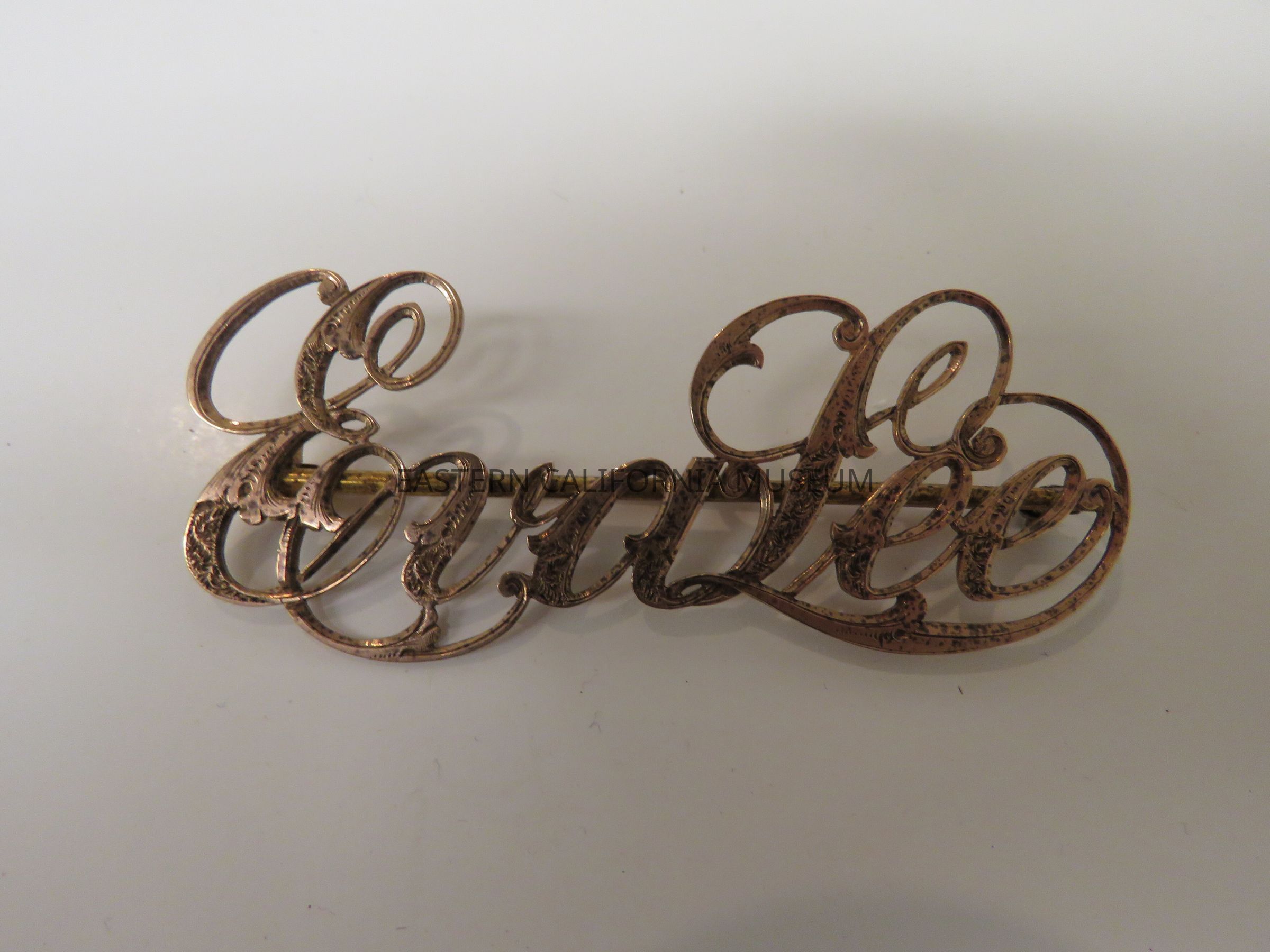 Lady's dress pin that spells out "Eva Lee" in gold. Writing on back says, "May 1, 1883 / April 28, 1884 / C.H.G."