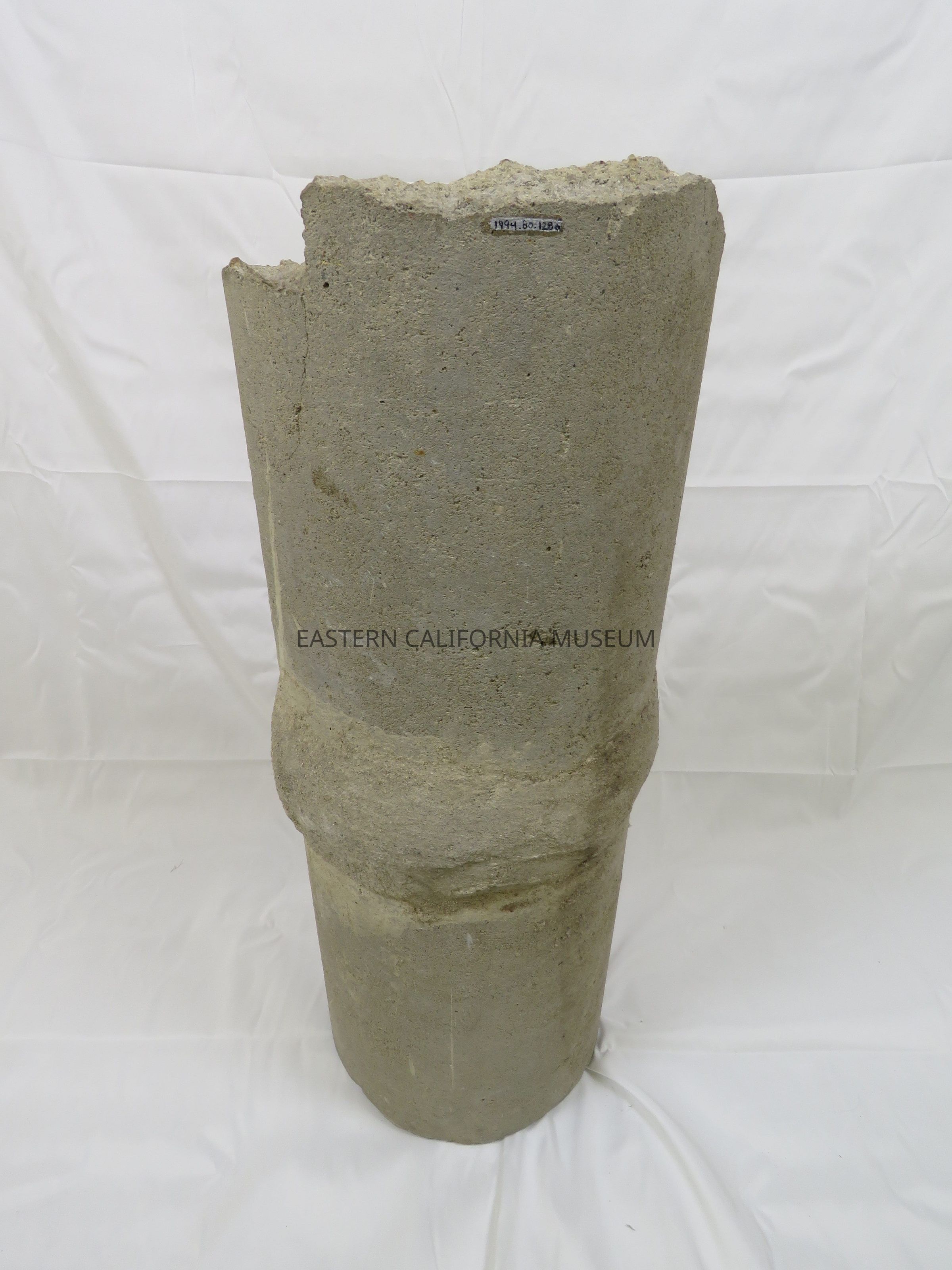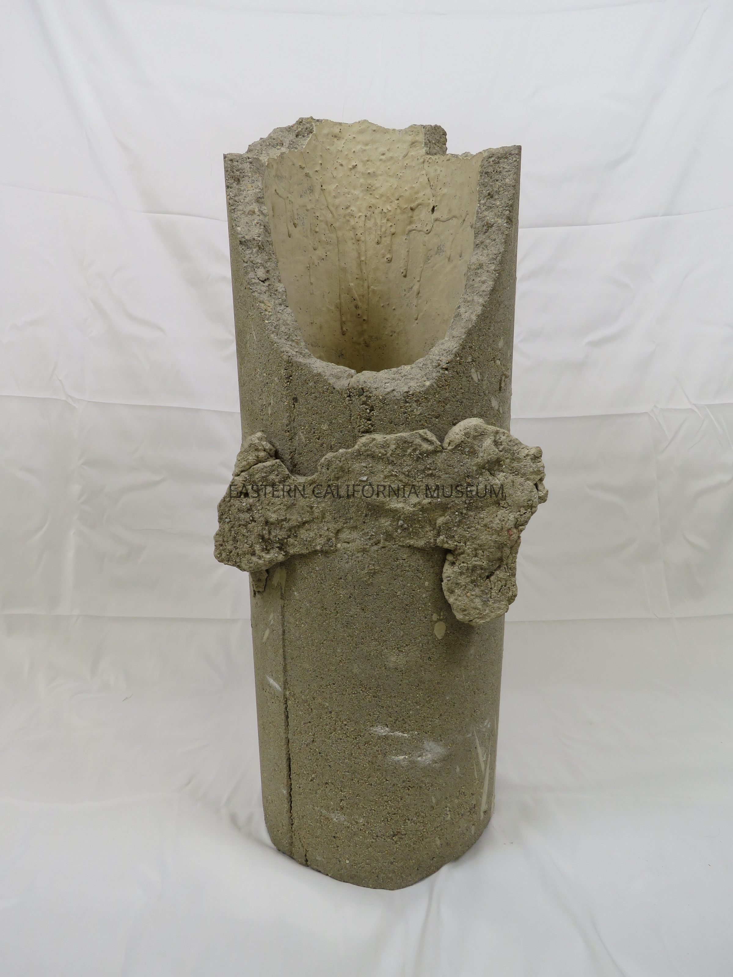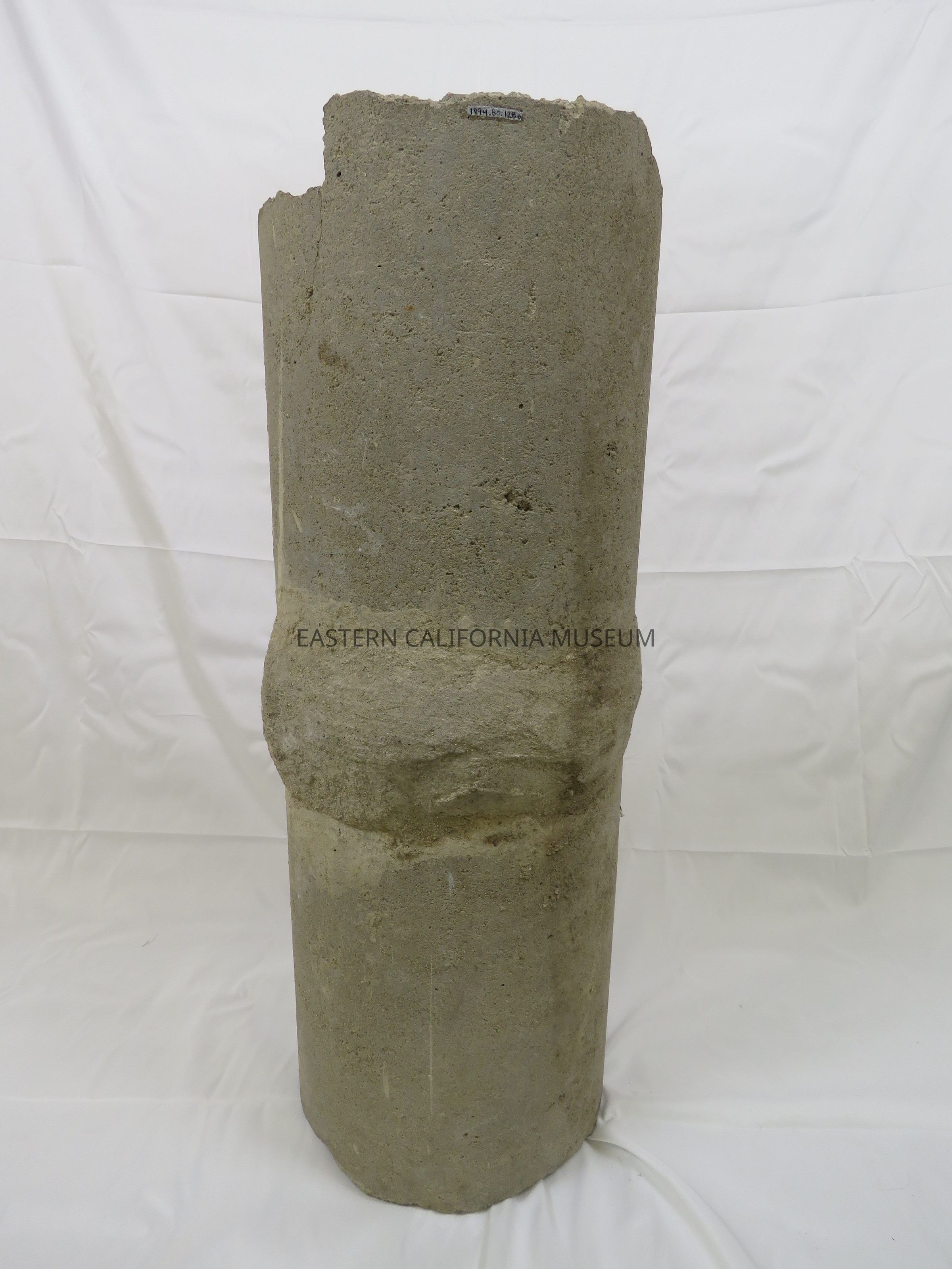 Section of concrete pipe from the "orchard community" town of Manzanar (pre-WWII) constructed by Van Lutzow circa 1910. The pipe was made in a cylindrical mold with added concrete at each seam when laid in ground. It was found east from the dam at Manzanar.Collection